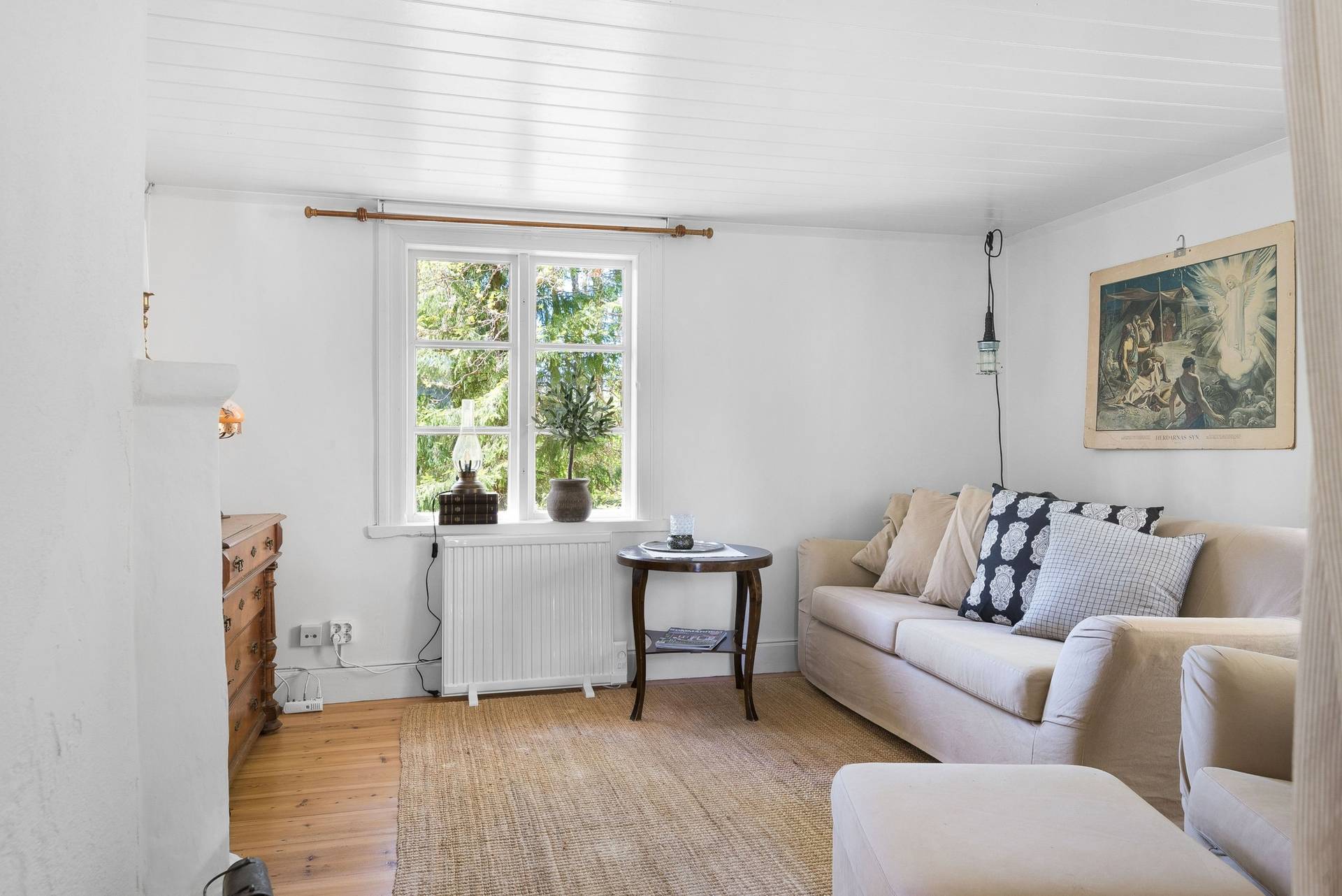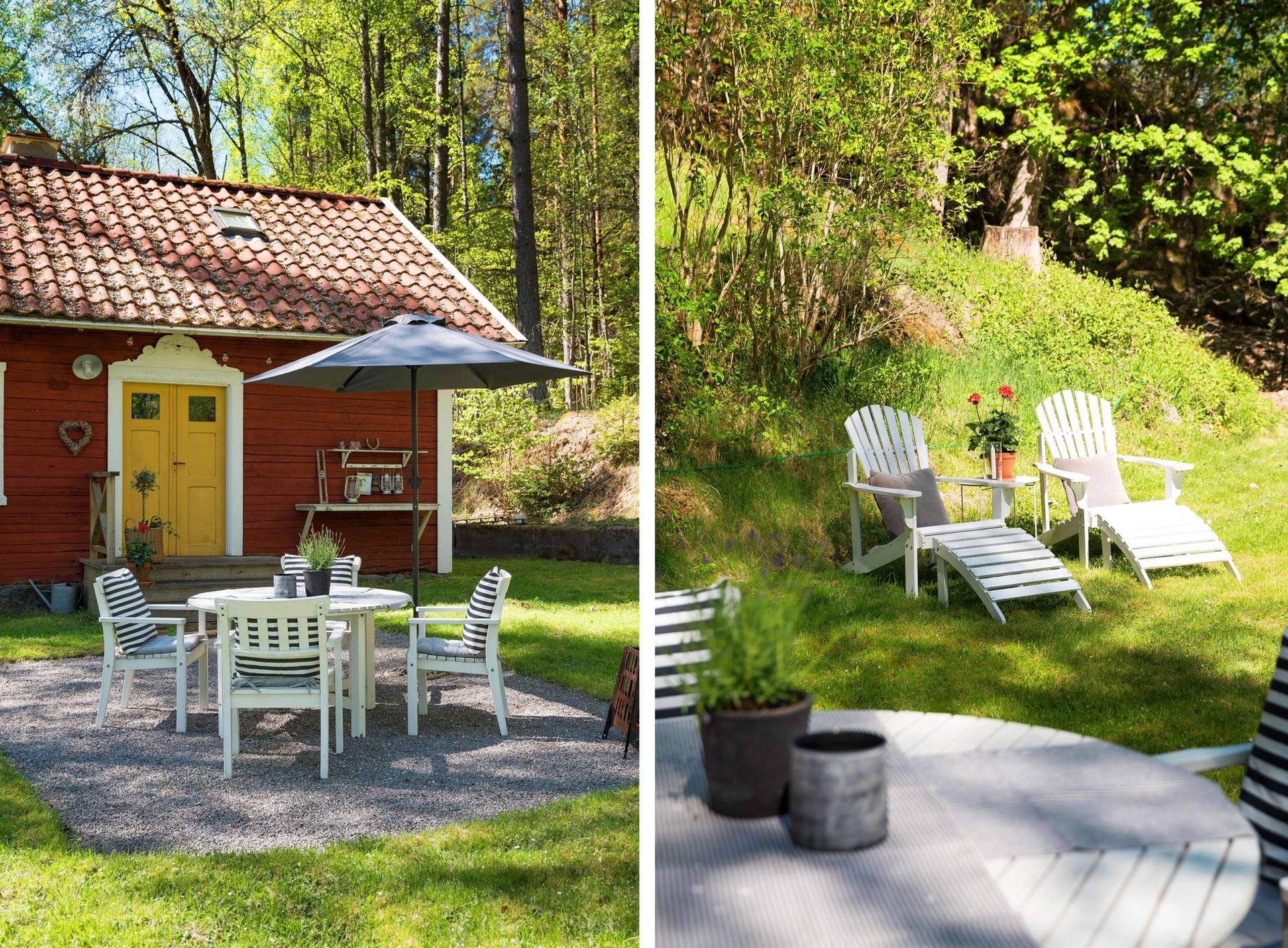 Het perceel is 1.120 m² groot en ligt op een heuvel, omgeven door bos. Op het erf staan een opslagschuurtje en een buitentoilet met buitendouche. Er is geen garage. Water komt van een eigen diepe put. Het rioolsysteem is een BDT-avlopp (bad, douche, wasmachine), wat betekent dat er geen binnentoilet op het riool is aangesloten. Internet of glasvezel wordt niet vermeld in de advertentie; navraag bij de makelaar is verstandig.