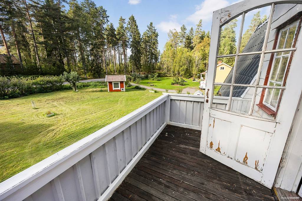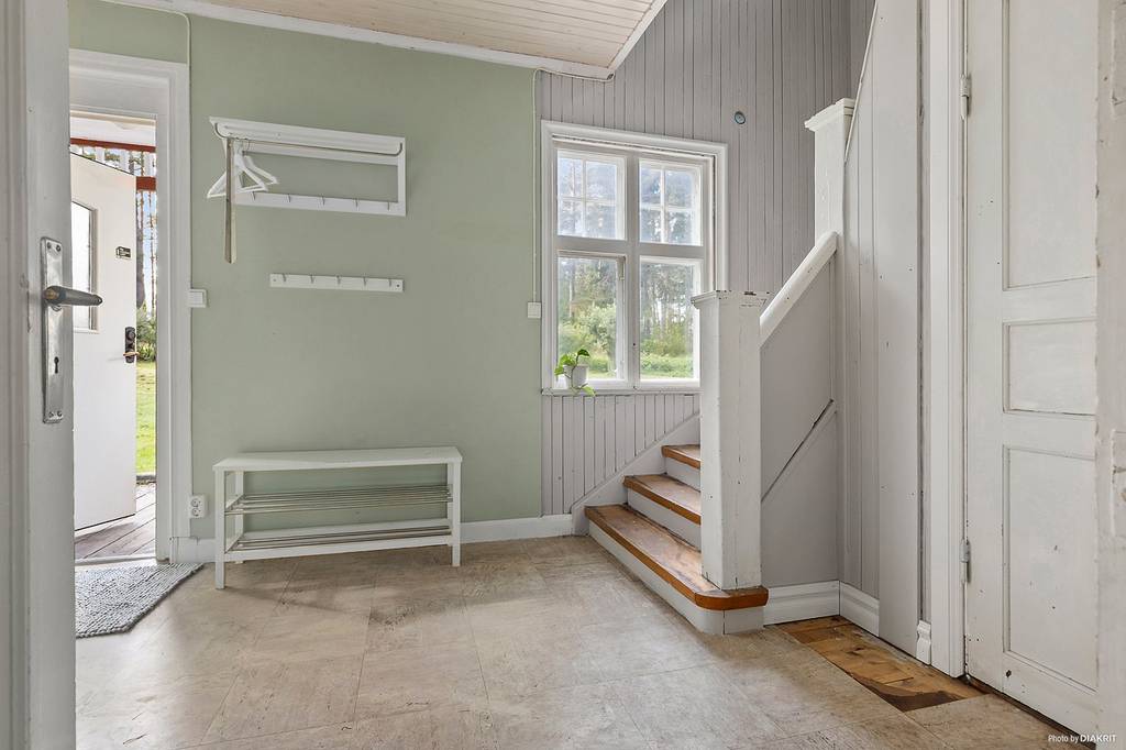 Op de bovenverdieping zijn drie slaapkamers en een hal met deur naar het balkon. De kamers zijn licht en huiselijk, met verschillende vloeren en behang. Het voelt bewoond en warm, zonder dat alles al strak is afgewerkt. Er is ook een klein tvättrum, praktisch als wasruimte, maar geen luxe badkamer. In de kelder zit het pannrum met het verwarmingssysteem en extra bergruimte voor hout, gereedschap en voorraad.