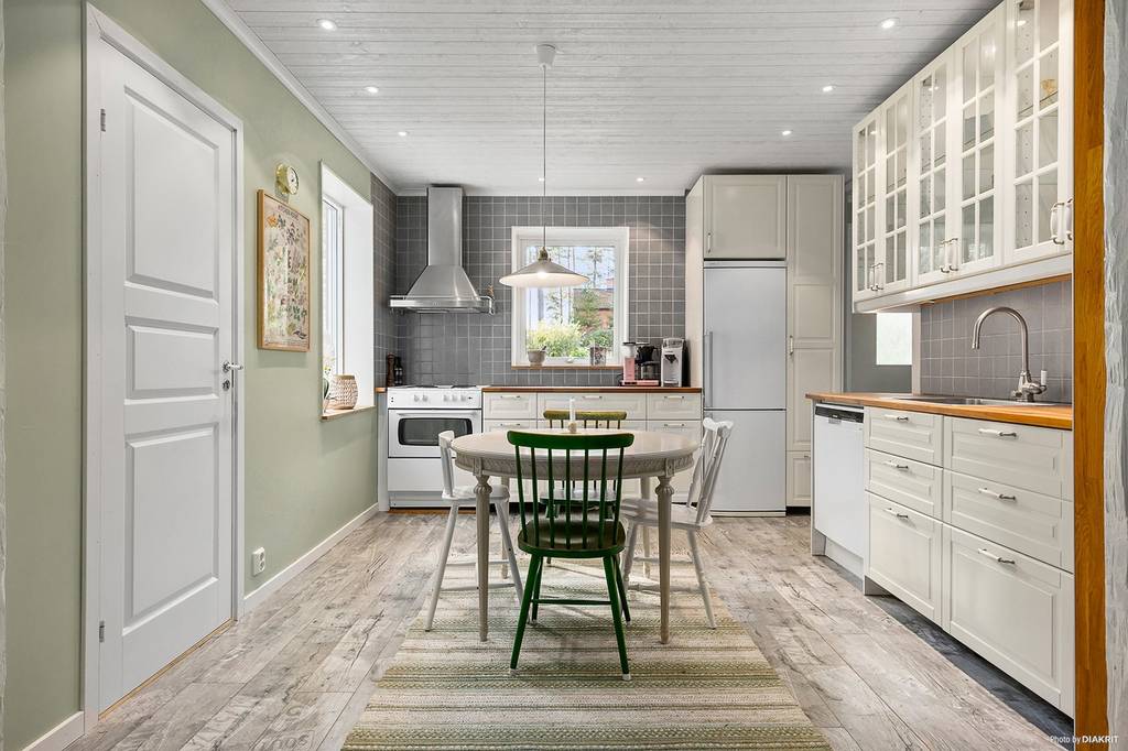 Je komt binnen in een eenvoudige maar uitnodigende hal, met direct daarnaast een toilet. De woonkamer is licht en heeft een houten furu-vloer en ramen richting de tuin, waardoor je de seizoenen echt meekrijgt. Aan de achterzijde ligt de keuken uit 2020, ruim opgezet met veel kastruimte, een groot schafferi en een extra koel-vriescombinatie.