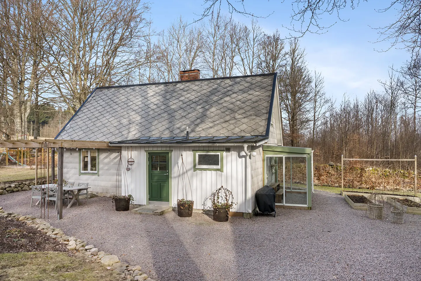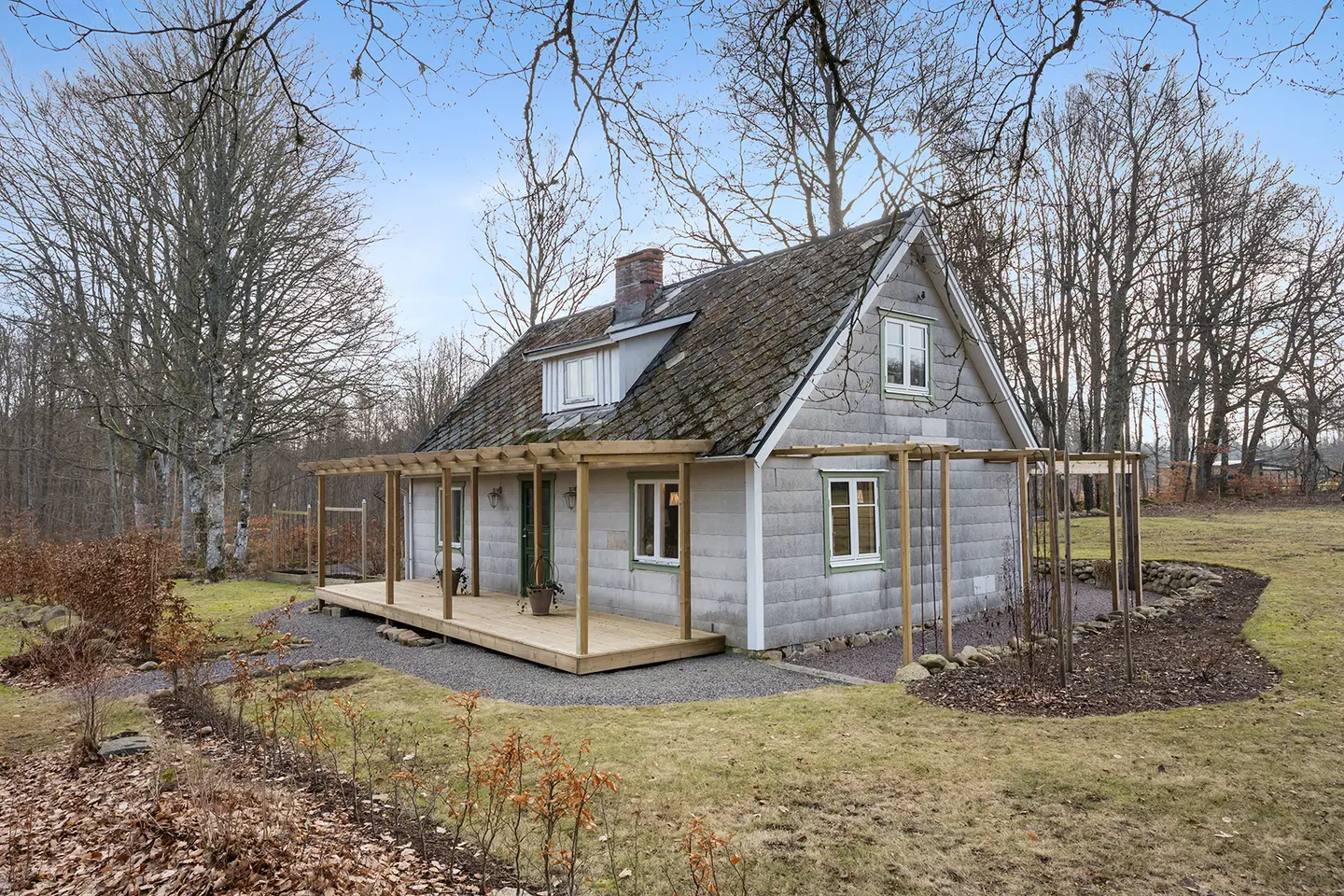 Deze 1½-verdiepingsvilla dateert uit 1909 en staat op een open plek in het bos bij Hishult, Laholms kommun. De woning telt 4 kamers, waarvan 3 slaapkamers, verdeeld over 80 m² woonoppervlak. Daarboven komt nog 20 m² biarea voor bijruimtes.