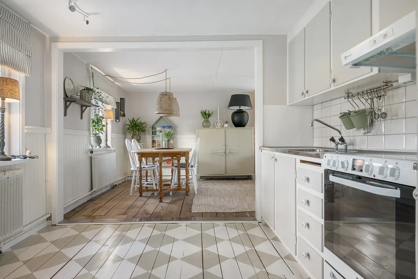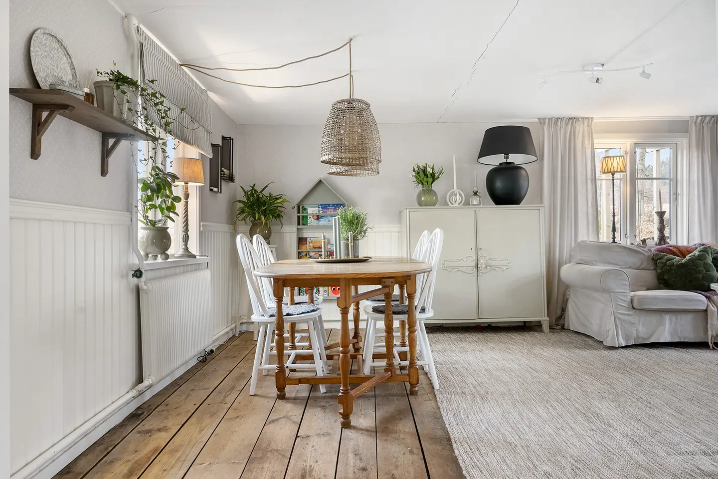De woning heeft karakter: originele houten vloeren, authentiek schrijnwerk en een interieur dat door de huidige eigenaar sfeervol is ingericht. Verwarming loopt via een waterverwarmingssysteem aangesloten op een pelletketel (pelletpanna) van het merk Norrahammar. Dat is zuiniger dan een open haard alleen, maar vraag de makelaar naar het jaarlijkse pelletverbruik voordat je rekent.