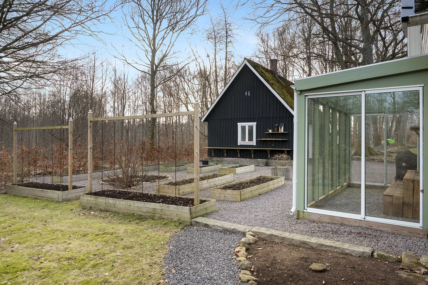 Het perceel is groot: 6.672 m², met een mix van open tuin en bosrand. Er is een bijgebouw met wasruimte en de stookruimte van de pelletketel. Aan een van de gevels zit een kleine bergruimte, en aan de voorzijde is recent een nieuw terras aangelegd.