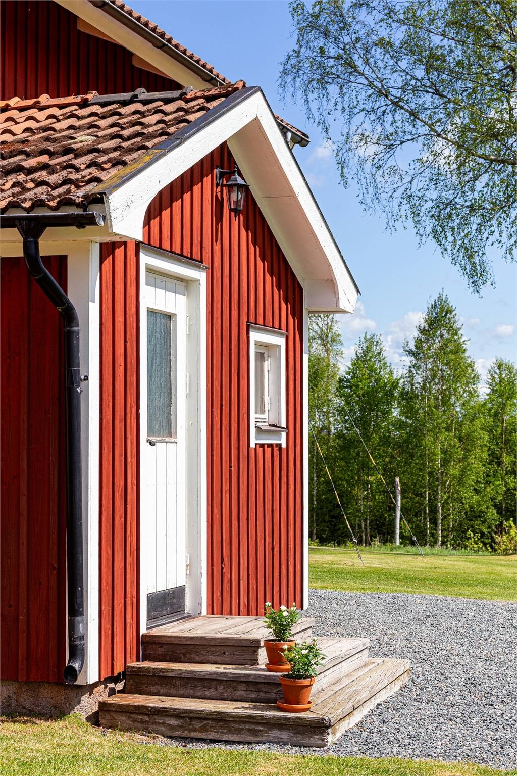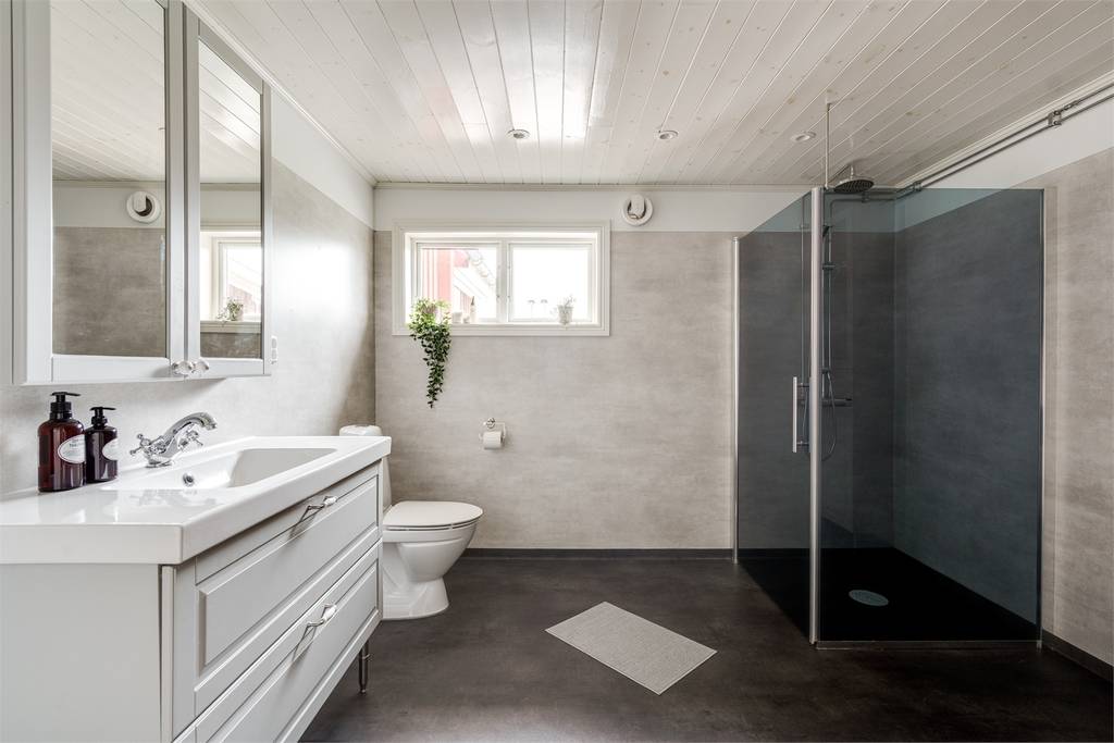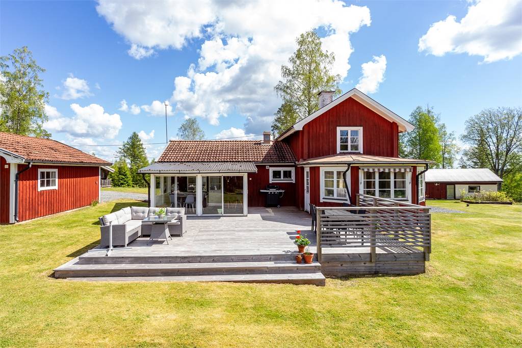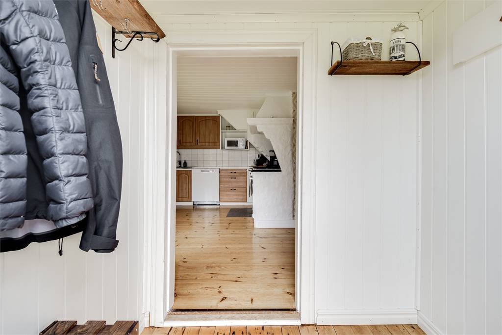 Op de begane grond kom je binnen in een praktische hal met ruimte voor jassen en laarzen, met direct ernaast een bijkeuken/wasruimte met aansluitmogelijkheden. Het keukenblok is compact maar functioneel, met moderne apparatuur gecombineerd met een authentieke vedkachel, een betegelde achterwand en spaarzaam geplaatste bergruimte. Aansluitend ligt de eetkamer met erker (burspråk), een plek waar je zo een lange fika of avondmaaltijd voor je ziet. De woonkamer heeft een bergslagskamin en openslaande deur naar de ingeglaasde altan, die in voorjaar en zomer bijna een extra woonkamer wordt. De badkamer beneden is in 2019 vernieuwd, met douche, toilet en wastafelmeubel; hier is ook voorbereiding gemaakt voor een wasmachine.