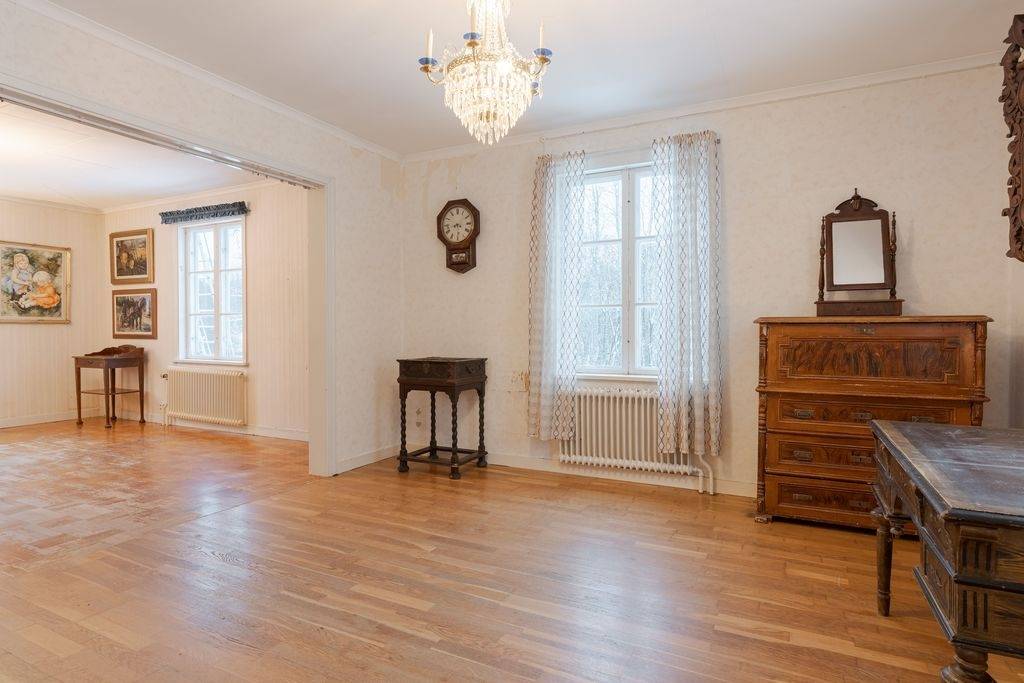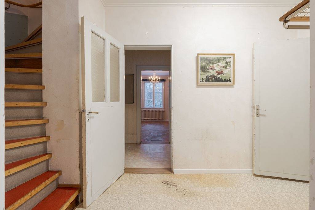 Dit charmante huis uit 1930 is een klassieke 1,5-plans villa met kelder. Binnen vind je een hal, een keuken met ruimte voor een eettafel, en een woonkamer die doorloopt in een 'finrum', wat zorgt voor een fijne leefruimte. Boven zijn er twee slaapkamers, een toilet en handige 'kattvindar' (bergruimte onder het schuine dak). Het huis heeft liefde en aandacht nodig ("slitet"), dus het is een perfect project voor de handige klusser die zijn eigen stempel wil drukken.