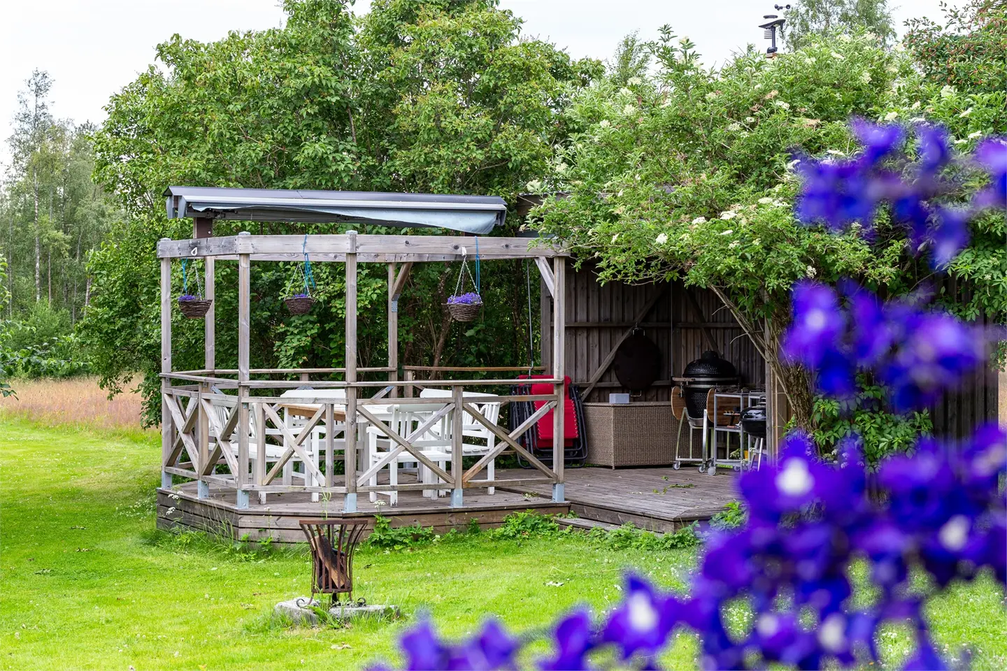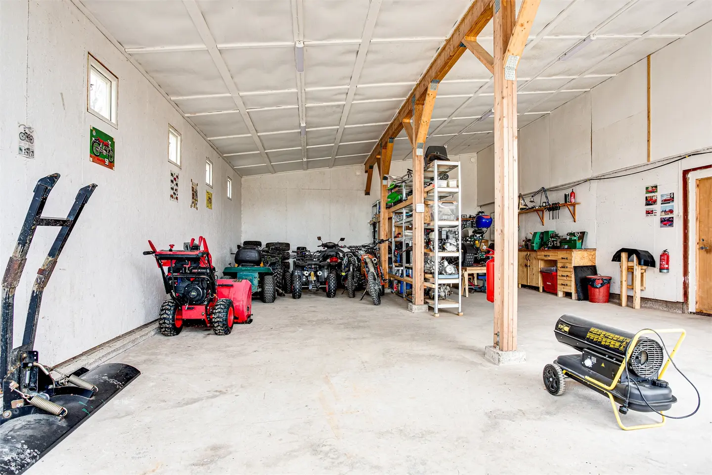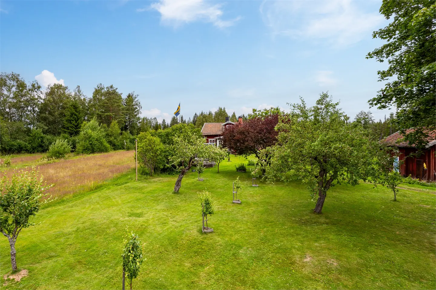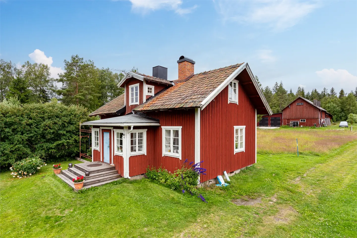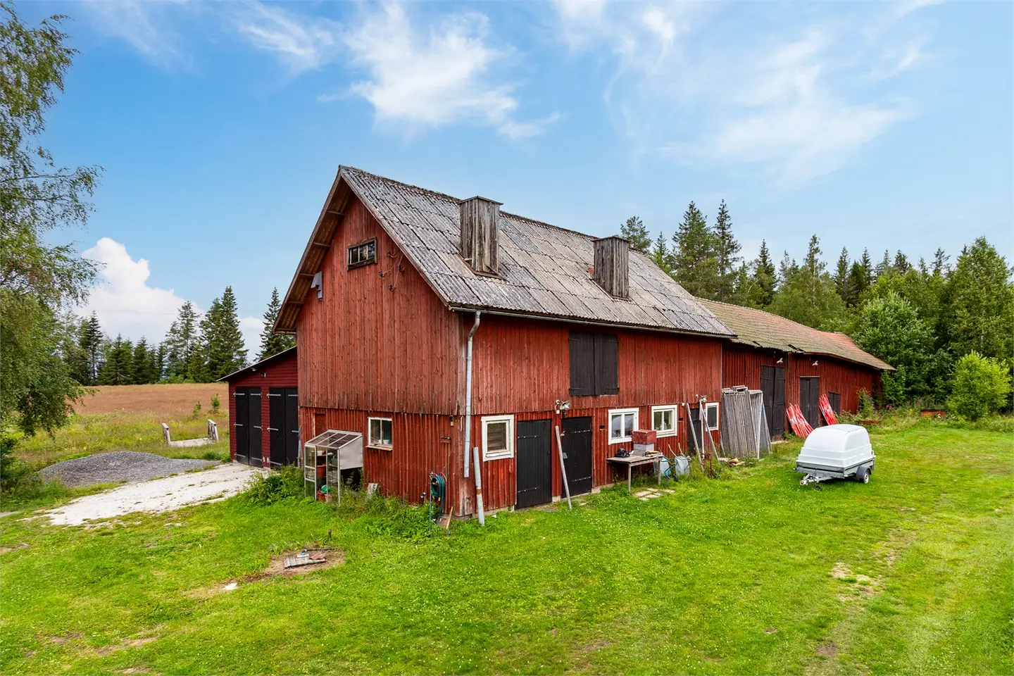 Op het erf staan een garage met werkplaats en een bijgebouw dat als gastenverblijf of evenementenruimte kan dienen. De woning heeft eigen watervoorziening (enskilt vatten, het hele jaar door beschikbaar) en een eigen septic systeem (enskilt avlopp). Glasvezel is niet beschikbaar in dit gebied.